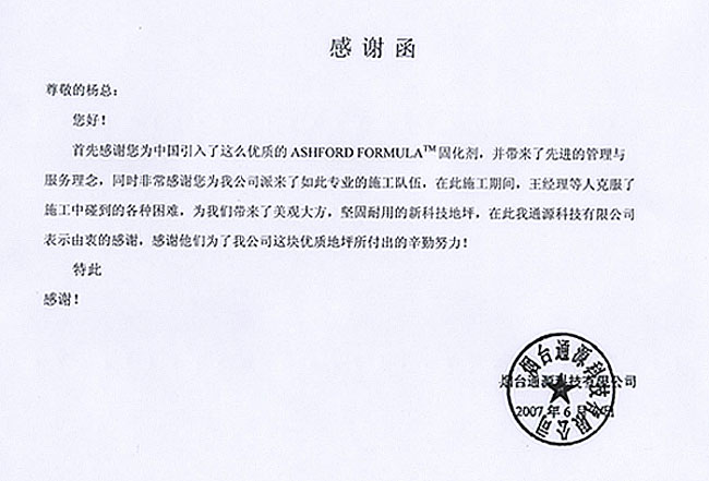 烟台通源科技有限公司感谢函